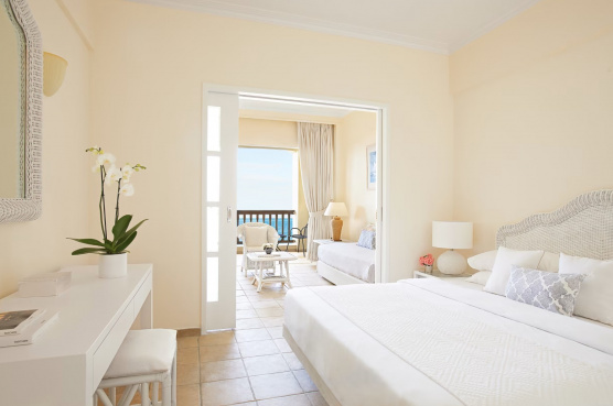 - 35 m², Hauptgebäude oder Gartenbereich, 2 Schlafzimmer durch Schiebetür getrennt, 1 Bad, Dusche/WC, Föhn, Kaffee-/Teezubereiter, Sat-TV, Telefon, Keramikboden, Balkon oder Terrasse, WLAN (inklusive), Safe (inklusive), Minikühlschrank, Klimaanlage (inklusive, zentral gesteuert), zusätzliche Schlafmöglichkeit, Meerblick gegen Aufpreis