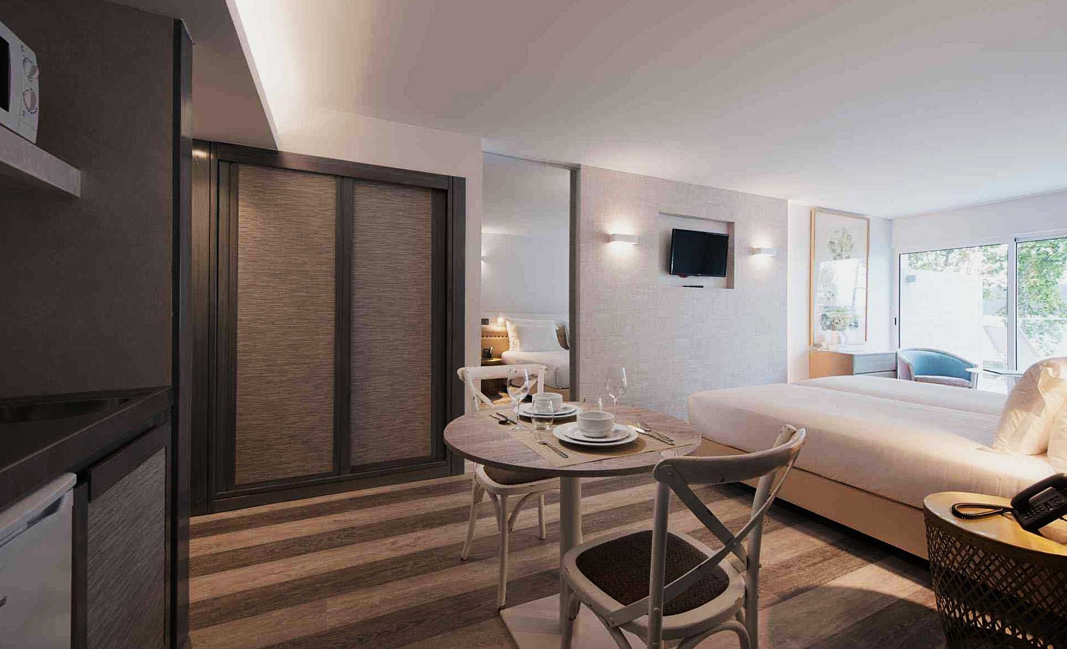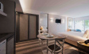 - Die ca. 30 m² großen und modernen Studios mit seitlichem Meerblick (M2S) verfügen über ein Bad mit Dusche und WC, Föhn, Klimaanlage, Flat-Screen TV, Telefon, Minibar (gegen Gebühr), Wi-Fi (inklusive), Schreibtisch, eine voll ausgestattete Kitchenette und einen möblierten Balkon mit seitlichem Meerblick.