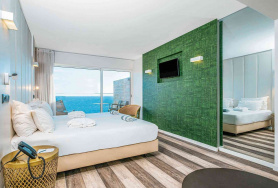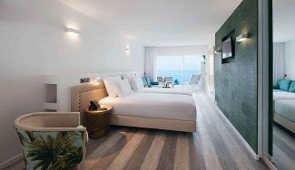 - Die Familenzimmer seitlicher Meerblick (FS) bestehen aus 2 Doppelzimmern mit Verbindungstür, sind geräumig und elegant eingerichtet. Sie verfügen über ein Bad mit Dusche und WC, Föhn, Klimaanlage, Flat-Screen TV, Telefon, Minibar (gegen Gebühr), Wi-Fi (inklusive), Schreibtisch und einen möblierten Balkon mit seitlichem Meerblick.