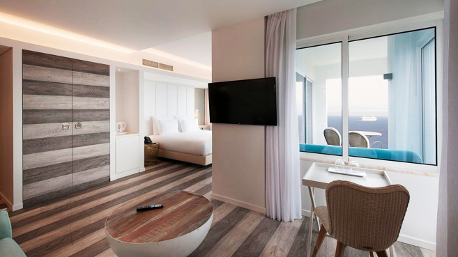 - Die geräumigen Juniorsuiten mit Meerblick (J2M) sind ca. 40 m² groß, verfügen über einen geräumigen Balkon mit fantastischem Blick auf den Atlantik sowie einen größzügigen Wohnbereich mit Schlafsofa. Zur weiteren Ausstattung gehören ein Bad mit Dusche und WC, Föhn, Klimaanlage, Flat-Screen TV, Telefon, Minibar (gegen Gebühr), Wi-Fi (inklusive) und ein Schreibtisch.
