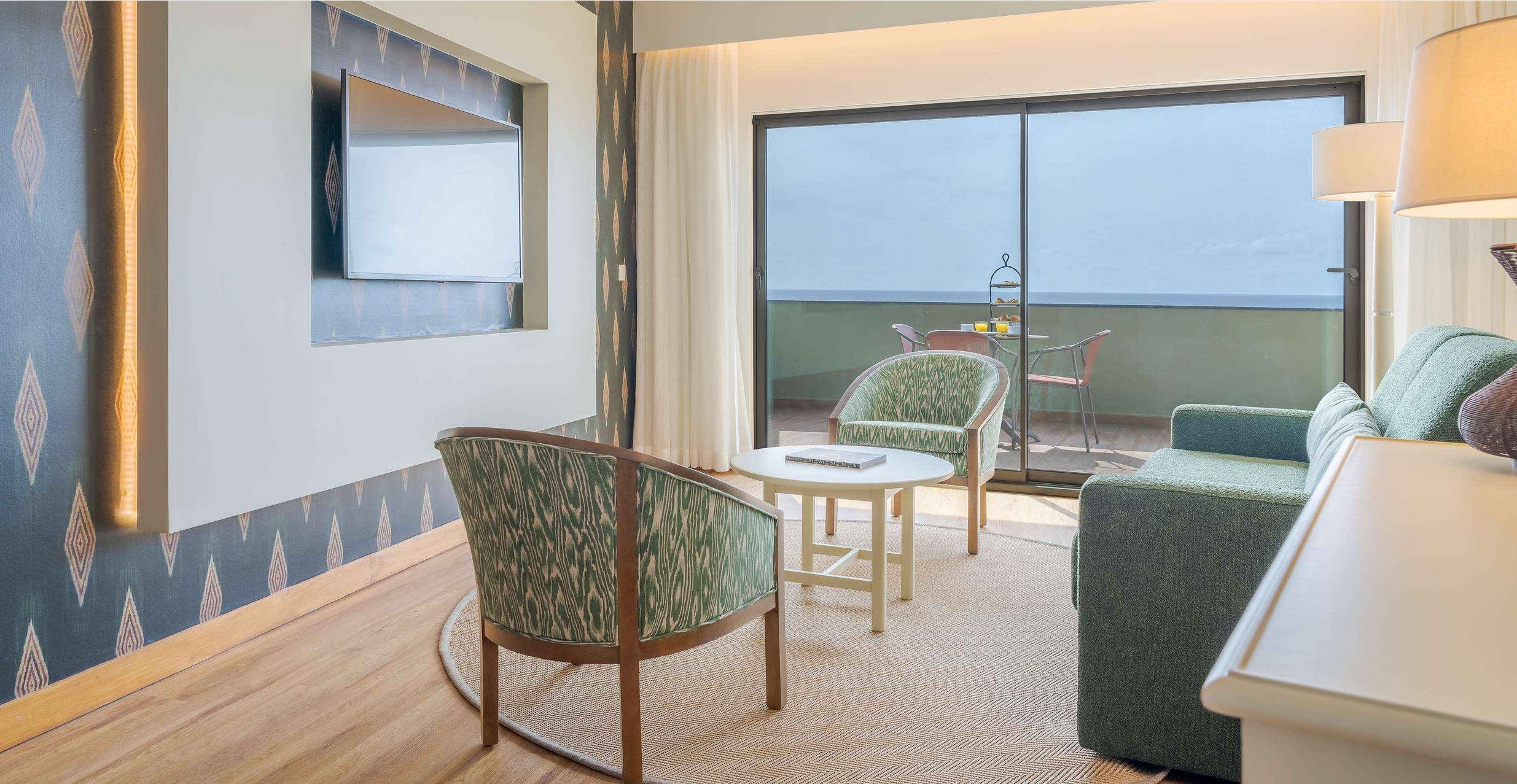 - 61-70 qm, Suite, Etage, 4., 5., 6., 7., 8., Meerblick, separates Schlafzimmer, kombinierter Wohn-/Schlafraum, Schreibtisch, Doppelbett, Sofabett, Dusche, Haartrockner, Klimaanlage, Minibar kostenpflichtig, Safe, TV, WLAN, Kaffee/Tee, Balkon (möbliert)
