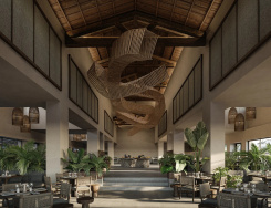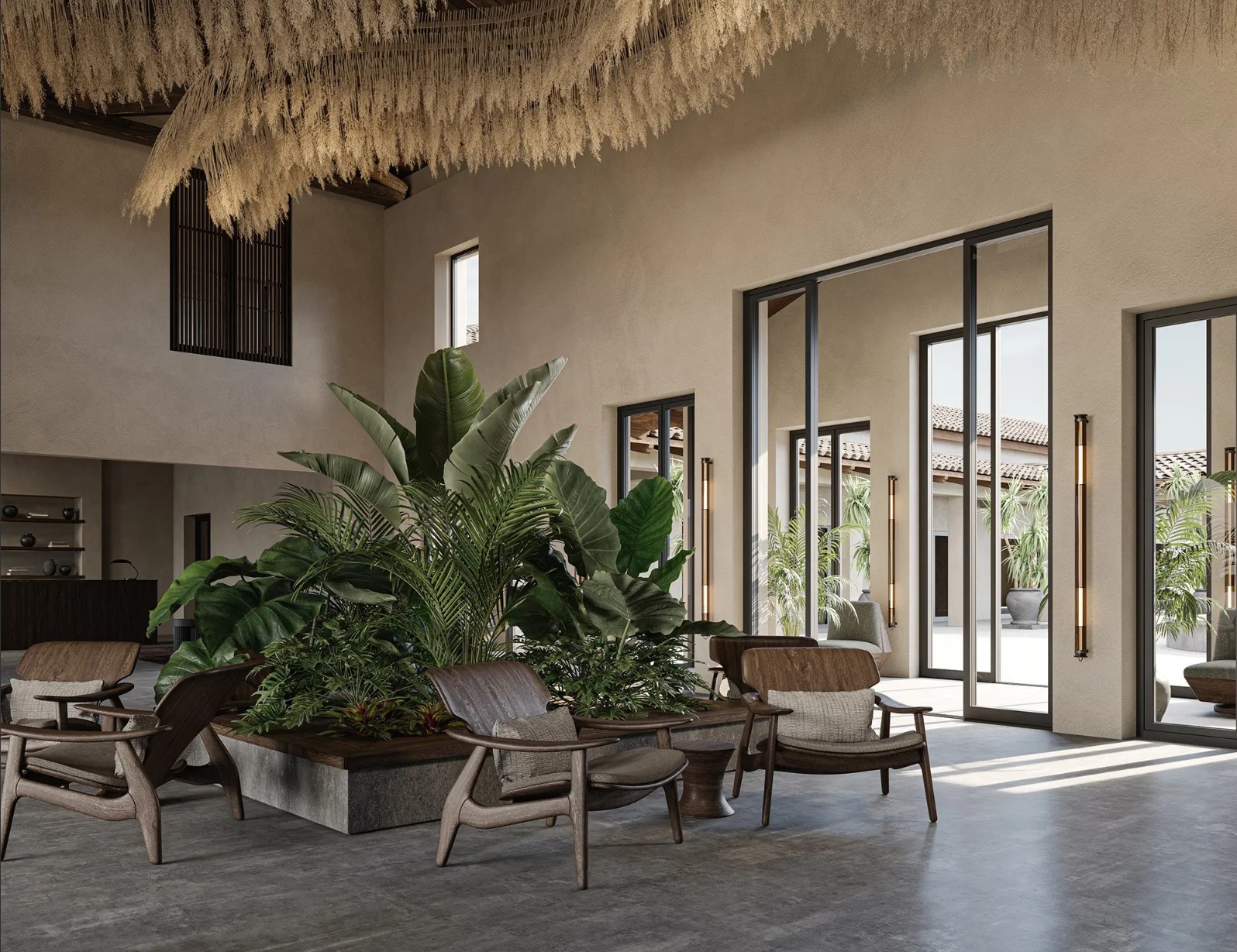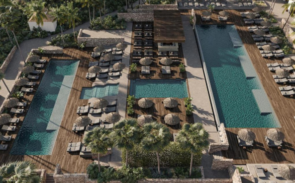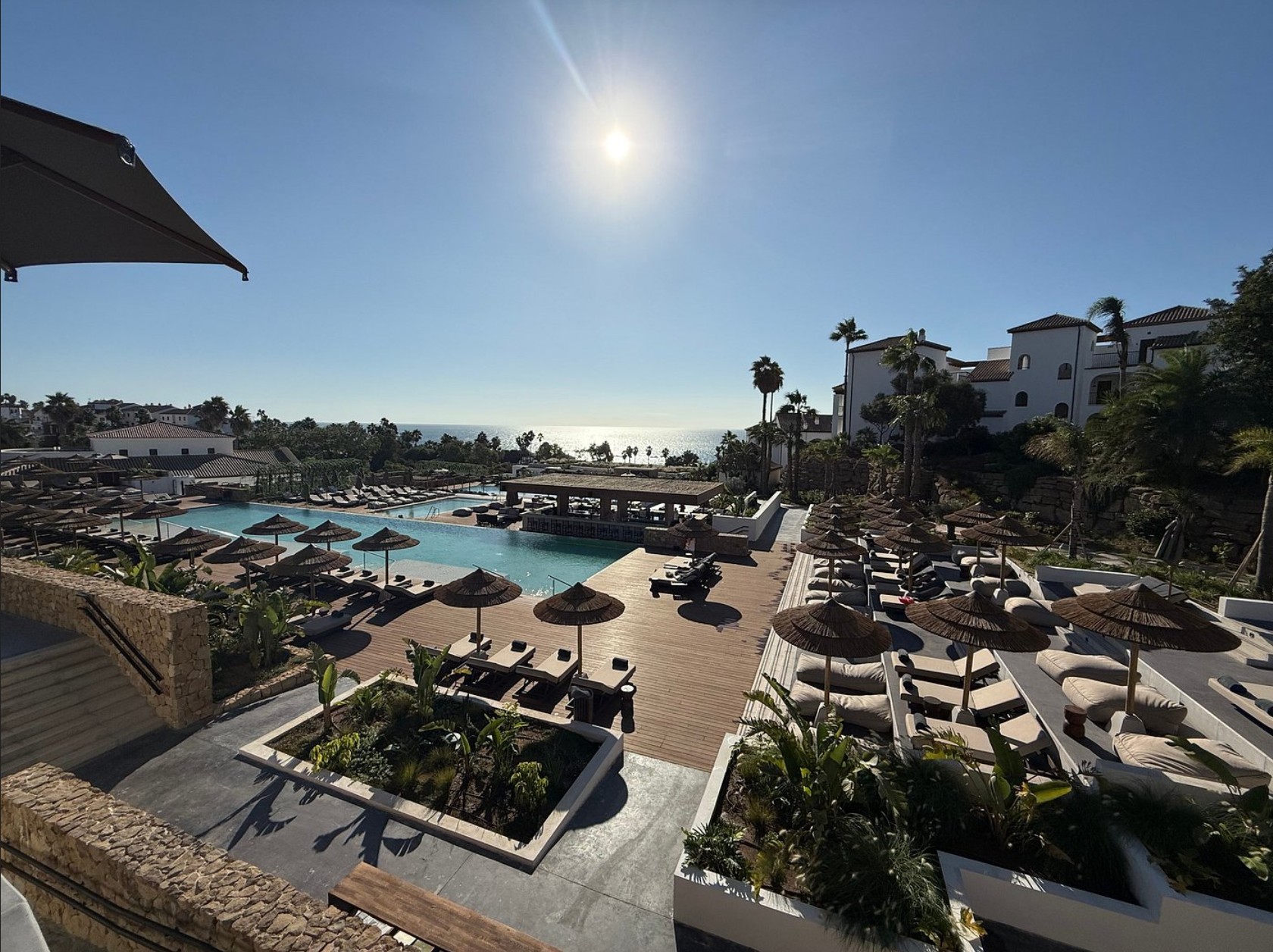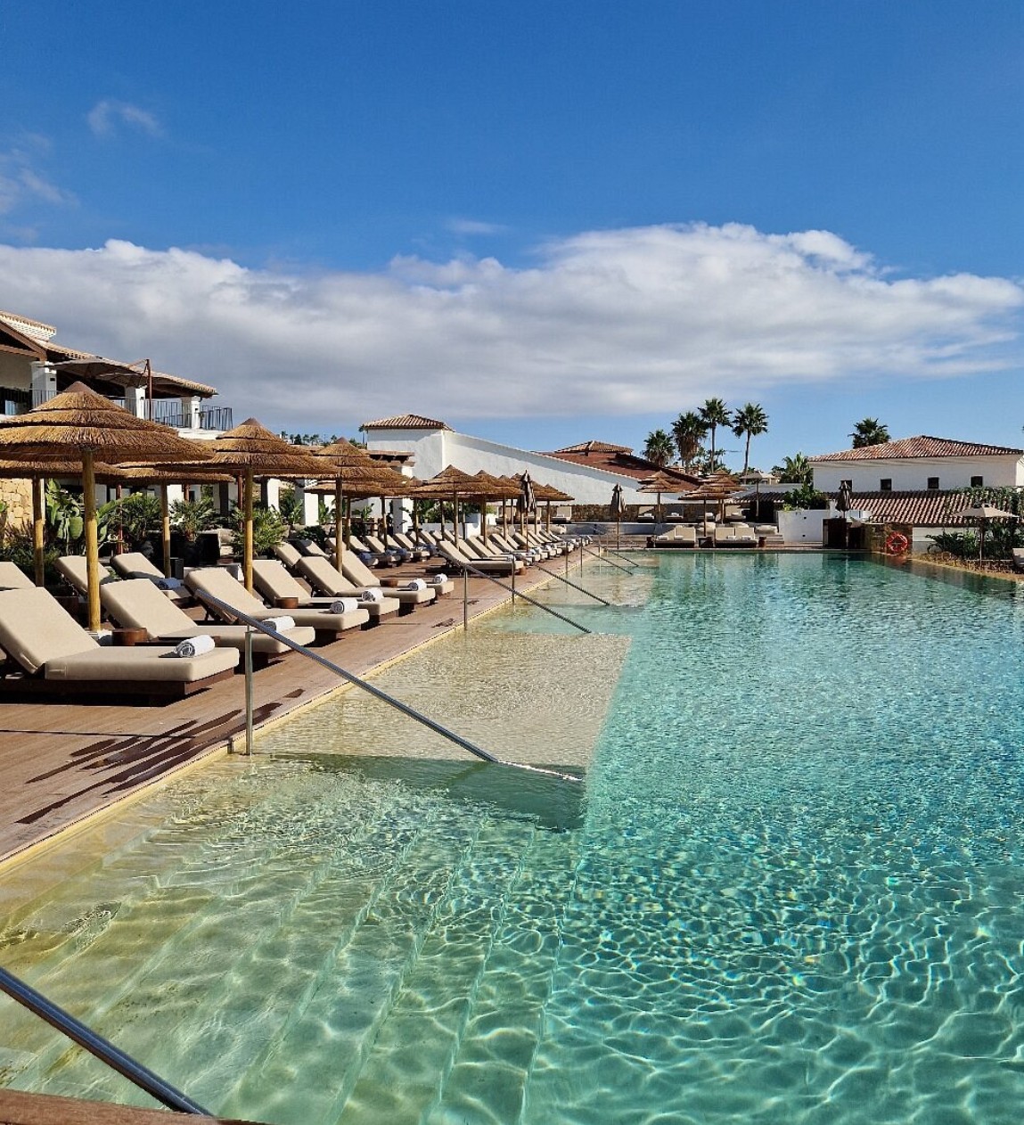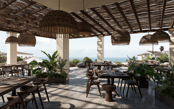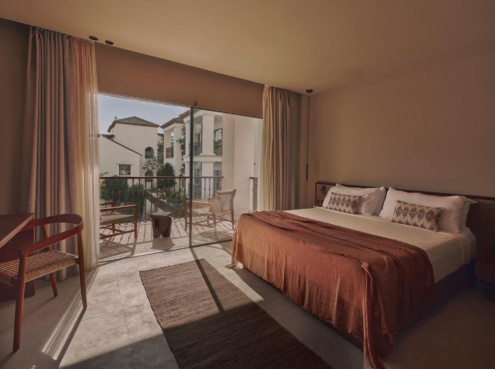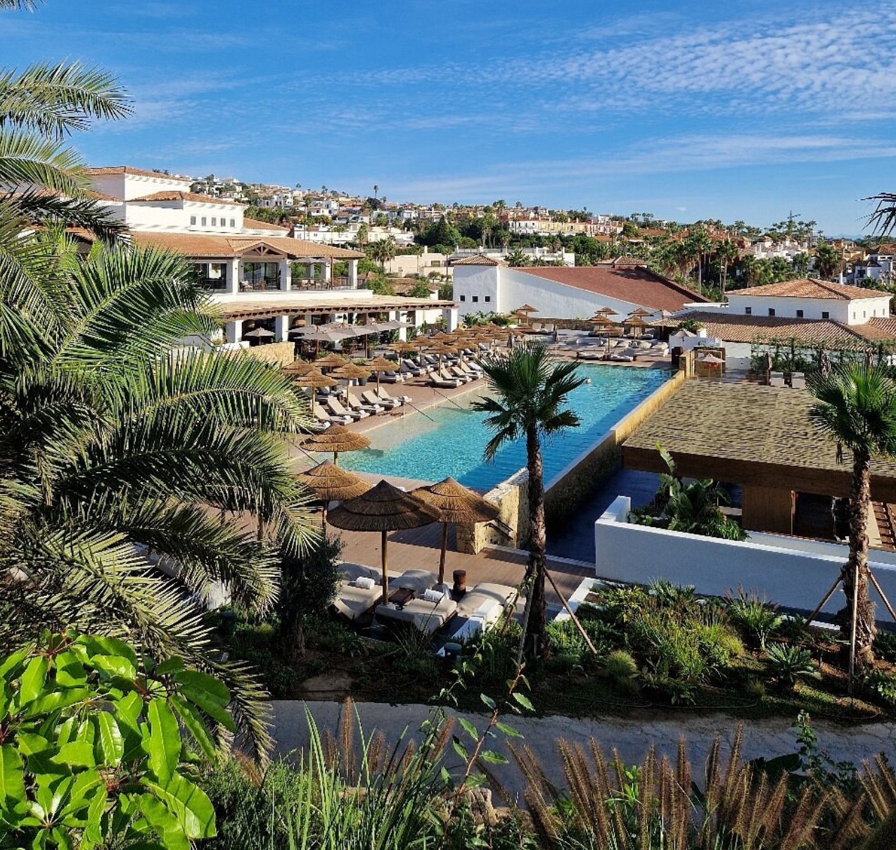 - Schatten spendende Palmen, plätschernde Wasserelemente und Pool-Lounges laden zum Verweilen ein, während sanfte House-Beats für eine entspannte Urlaubsstimmung sorgen. Inspiriert von der japanischen Wabi-Sabi-Philosophie und andalusischer Architektur, vereint die exklusive Rückzugsoase minimalistisches Design mit warmen, erdigen Farbtönen und natürlichen Materialien wie Holz, Stein und Leinen.