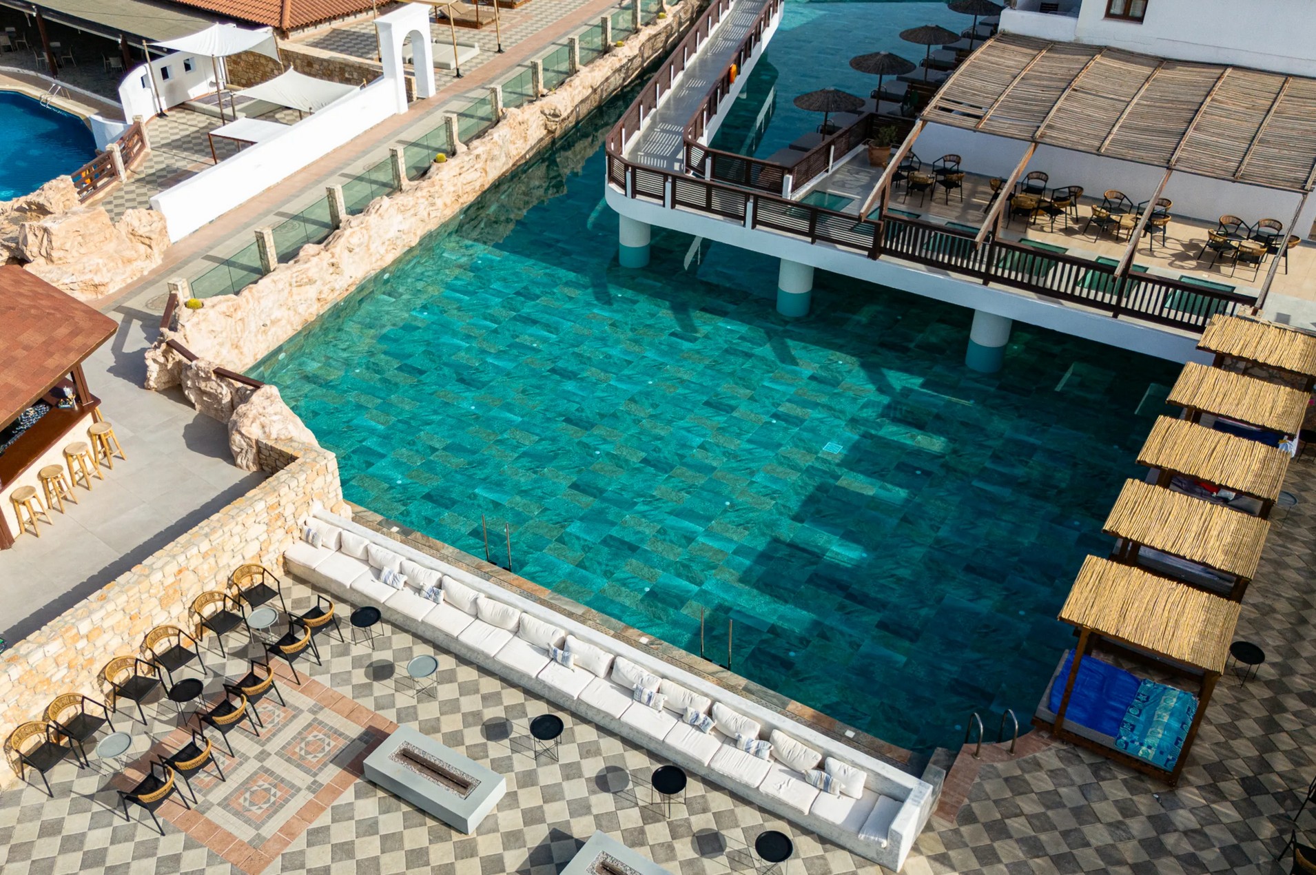 - traumhafte Swimmingpool-Landschaft, bestehend aus 5 Pools mit Brücken, Wasserfällen und umgeben von neu angelegten Sonnenterrassen mit bequemen und inkludierten Sonnenliegen, Sonnenschirmen, Sitzkissen sowie vereinzelten Balibetten.