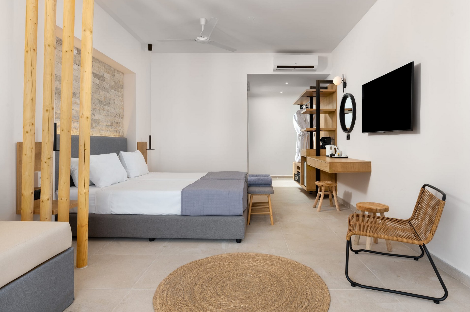 - Ein schauinsland-reisen original und für Gäste ab 15 Jahren buchbar. Die seit Sommer 2023 renovierten Zimmer sind im Erdgeschoss gelegen und verfügen über ein renoviertes Bad mit Walk-In Dusche/WC, Föhn, Bademäntel und Slipper, Kosmetikspiegel sowie Pflegeprodukte. Zur weiteren Ausstattung gehören ein Ganzkörperspiegel, individuell regulierbare Klimaanlage, Deckenventilator, Telefon, Safe, 50" Smart-TV mit HDMI-Anschluss, Minibar (tägliche Auffüllung der Minibar mit 2 Flaschen Wasser, 2 Softdrinks, 2 Bieren sowie die Bereitstellung einer 1L Wasserflasche inklusive), Kaffee- und Teeset mit täglicher Auffüllung, Espresso-Maschine (Auffüllung mit 2 Kapseln pro Tag) sowie eine großzügige Terrasse mit gemütlichen Sonnenliegen, Tisch und Stühlen und direktem Zugang zum Sharing Pool (SH2/HA2).