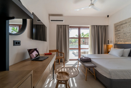 - Diese seit Sommer 2024 renovierten Suiten sind als schauinsland-reisen original buchbar und bestehen aus 2 separaten Schlafräumen, jeweils mit einem angrenzenden Badezimmer (eines halboffen gestaltet) mit Walk-In Dusche und WC,Föhn, Bademänteln und Slipper, Kosmetikspiegel und Pflegeprodukten. Zu den weiteren Ausstattungsmerkmalen zählen zwei 50" Smart-TV mit HDMI-Anschluss, Ganzkörperspiegel, individuell regulierbare Klimaanlage, Deckenventilator, Telefon, Safe, Minibar (tägliche Auffüllung der Minibar mit 2 Flaschen Wasser, 2 Softdrinks, 2 Bieren sowie die Bereitstellung einer 1L Wasserflasche inklusive), Kaffee- und Teeset mit täglicher Auffüllung, Espresso-Maschine (Auffüllung mit 2 Kapseln pro Tag) sowie eine neu möblierte Terrasse mit komfortablen Daybeds und direktem Zugang zum Hauptpool (S2O).