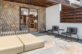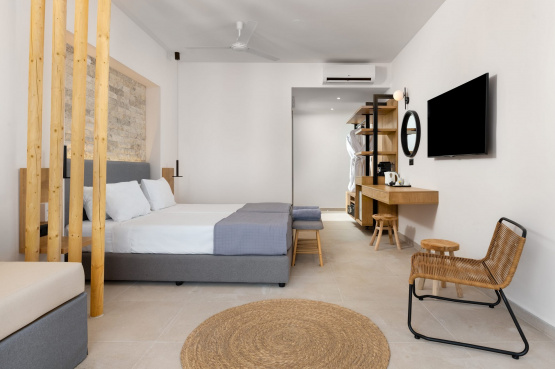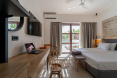 - Die seit Sommer 2024 renovierten Juniorsuiten bestehen aus einem kombinierten Wohn-/Schlafraum mit einer kleinen optischen Abtrennung, Schlafsofa für die 3. Person und befinden sich in der 1. oder 2. Etage. Weitere Ausstattungsmerkmale sind ein renoviertes Bad mit Walk-In Dusche/WC, Föhn, Bademänteln und Slipper, Kosmetikspiegel, Pflegeprodukten, Ganzkörperspiegel, individuell regulierbare Klimaanlage, Deckenventilator, Telefon, Safe, 50" Smart-TV mit HDMI-Anschluss, Minibar (tägliche Auffüllung der Minibar mit 2 Flaschen Wasser, 2 Softdrinks, 2 Bieren sowie die Bereitstellung einer 1L Wasserflasche inklusive), Kaffee- und Teeset mit täglicher Auffüllung, Espresso-Maschine (Auffüllung mit 2 Kapseln pro Tag) sowie ein neu möblierter Balkon mit seitlichem Meerblick (J2S/J2A/JK3/JK4).