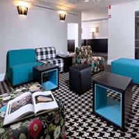 Lobby mit Rezeption, WLAN, Wechselstube, Restaurant, TV-Raum und Dachterrasse.