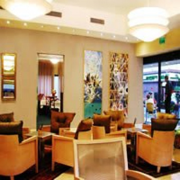 Rezeption, WLAN, Speisesaal und Coffee-Shop mit Strassenterrasse.