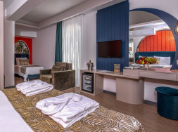 - separates Schlafzimmer, Klimaanlage, Minibar, TV, Telefon, Kaffee-/Teezubereiter, WLAN, Safe. 2 Badezimmer, Dusche, WC, Föhn. Balkon oder Terrasse mit Gartenblick, wahlweise im Erdgeschoss, mit Jacuzzi auf der Terrasse, mit kleinem Garten (FZA) buchbar. Max. 4E+1K