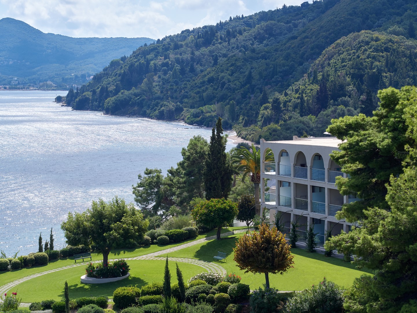 Corfou - Agios Ioannis Peristeron | TOP 5 | Complexe hôtelier adapté aux familles avec maison principale et bâtiments annexes. La légère pente permet d'avoir une vue magnifique sur la mer. Le jardin offre des endroits calmes pour se détendre.