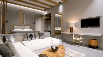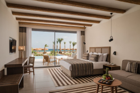 - 51-60 m², familles, avec porte communicante, Deluxe, vue sur la piscine, chambre à coucher séparée, lit double (queen-size), douche, WC, peignoir, chaussures de bain, sèche-cheveux, miroir cosmétique, climatisation, minibar payant, coffre-fort, TV (TV par satellite), bouilloire, café/thé, terrasse, service de réveil nocturne, à l'arrivée en chambre fruits, petits gâteaux
