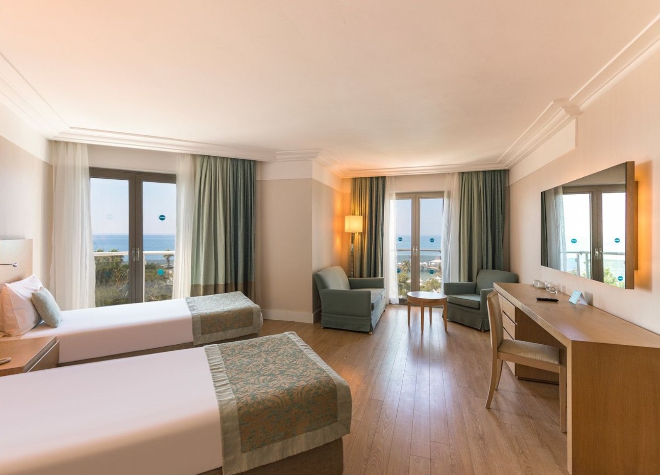 - Chambre familiale, dans le bâtiment principal, côté mer, vue sur la mer, vue sur la mer limitée, env. 42 m², dernière rénovation partielle en 2013, composée de 2 chambres doubles avec porte communicante, 2 lits simples (90x200cm), 1 lit double (160x200cm), lit bébé : sans frais, climatisation : réglable individuellement, froid, chaud, sol : stratifié, coffre-fort : sans frais, bouilloire électrique, minibar : sans frais, boissons non alcoolisées, eau, réapprovisionnement du minibar : tous les jours, téléphone, Internet : WLAN/WiFi : sans frais, télévision : chaînes allemandes, TV satellite, service de chambre : contre paiement, douche, WC, peignoir, pantoufles, sèche-cheveux, miroir cosmétique, balcon : avec possibilité de s'asseoir
