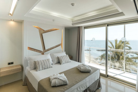 - Juniorsuite, im Hauptgebäude, Meerblick, ca. 35 m², letzte Komplettrenovierung 2017, Gesamtanzahl der Räume in diesem Zimmertyp: 2, Aufteilung wie folgt: kombiniertes Wohn-/Schlafzimmer, 1 Schlafzimmer, 1 Einzelbett (200x200cm), Babybett: ohne Gebühr, Reservierung notwendig, Klimaanlage: ohne Gebühr, Mai - Oktober, individuell regelbar, zentral gesteuert, Fußboden: Fliesenboden, Safe: ohne Gebühr, Minibar: ohne Gebühr, Softdrinks: ohne Gebühr, Wasser: ohne Gebühr, Snacks: ohne Gebühr, Telefon, Internet: WLAN/WiFi: ohne Gebühr, Fernseher: Flatscreen, im Wohnbereich, im Schlafzimmer, deutsches Programm, Sat-TV, Roomservice: täglich 10:00 Uhr - 22:00 Uhr, gegen Gebühr, Reinigungsservice: ohne Gebühr, Regendusche, WC, Bademantel: ohne Gebühr, Slipper: ohne Gebühr, Föhn, Balkon: mit Sitzgelegenheit