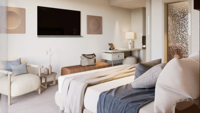 - 36-40 qm, Juniorsuite, Meerblick, Nichtraucher, 1 separates Schlafzimmer, kombinierter Wohn-/Schlafraum, Sofabett, 1 Bad, Dusche, Badewanne, separates WC, Haartrockner, Kosmetikspiegel, Klimaanlage, individuell regulierbar, Safe, Wasserkocher, Kühlschrank, Balkon oder Terrasse (möbliert)