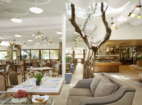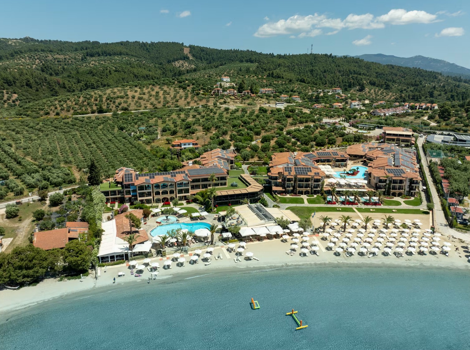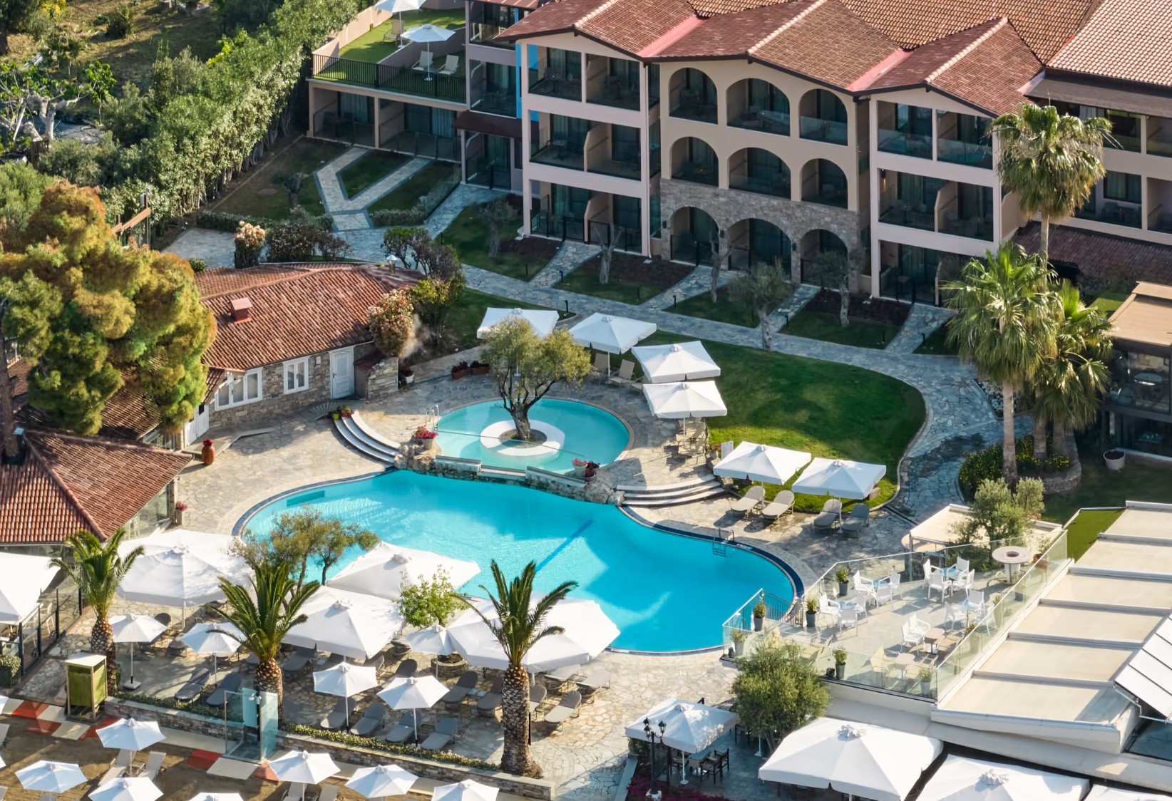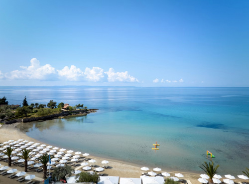 Chalkidiki - Elia | TOP 7 | Direkt am flach abfallenden Sand-/Kiesstrand in einer Bucht gelegen, macht diese sympathische Hotelanlage Ihren Urlaub mit vielen Details innerhalb des Resorts unvergesslich für Groß und Klein. Entspannung bietet u. a. der exzellente Spa- und Wellnessbereich.