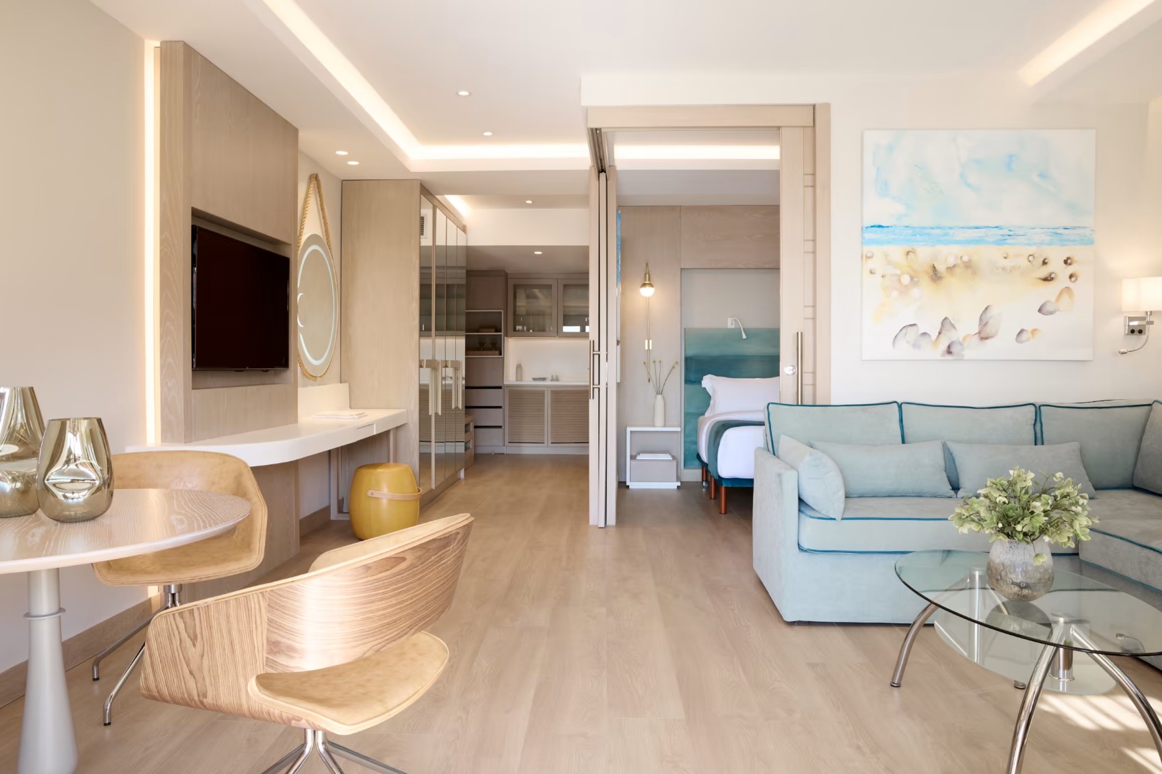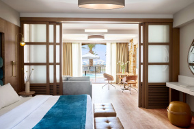 - Die renovierten, großzügigen und luxuriös eingerichteten Suiten verfügen bei gleicher Grundausstattung wie die Juniorsuiten über ein anderes Dekor, einen durch eine Schiebetür abtrennbaren Schlafraum sowie eine Espresso-Kapselmaschine. Balkon/Terrasse zur Landseite (SDG). Wahlweise auch mit Pool-/seitlichen Meerblick (PSN).
