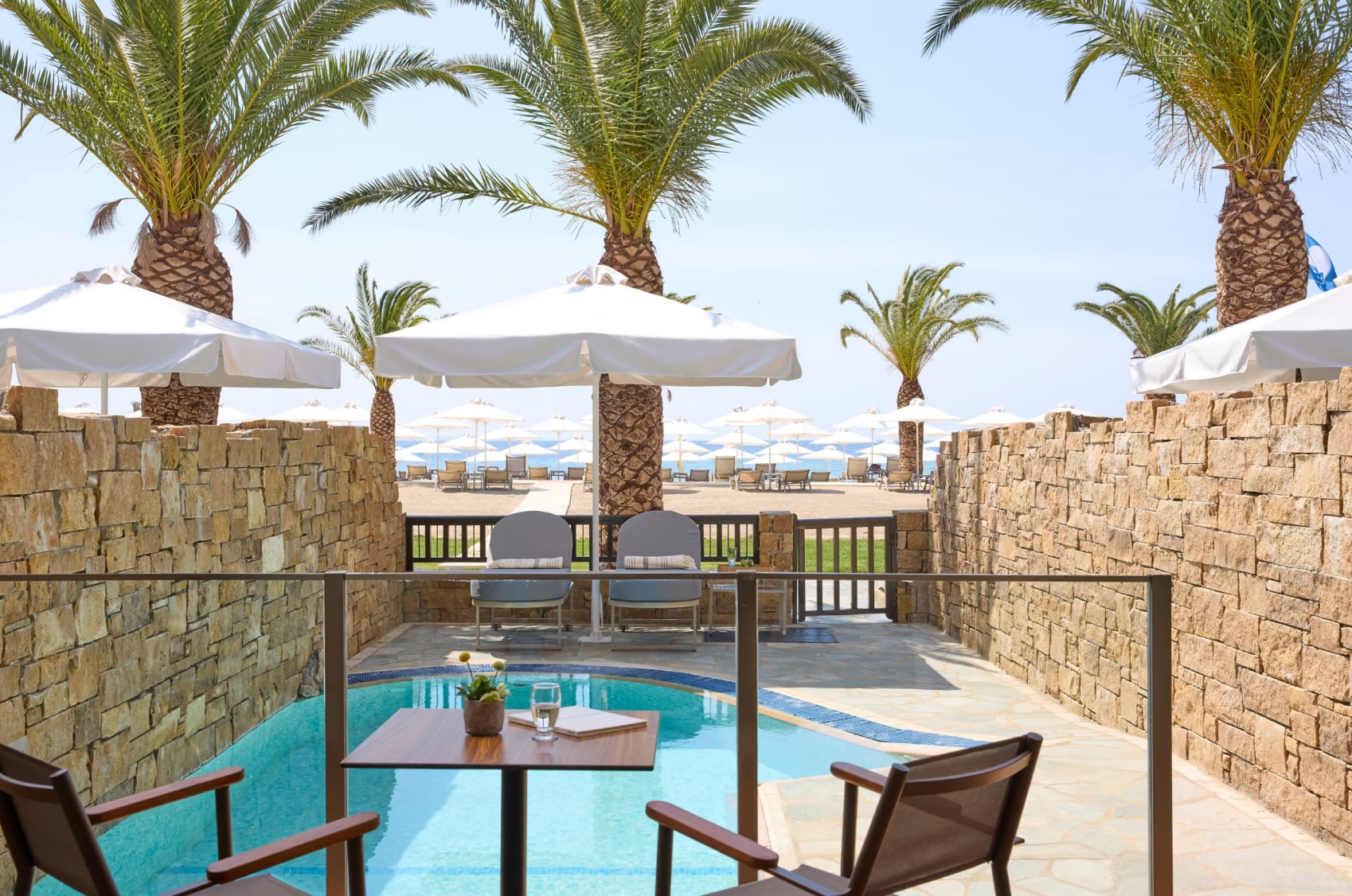 - Liegen/Sonnenschirme sind am Pool und am Strand inklusive, Badetücher (inklusive), ein Amphitheater und direkt am Strand befindet sich die Beach-Bar "Ammos" und die Strand-Taverne "Yialos", in der traditionelle griechische Küche à la carte angeboten wird.