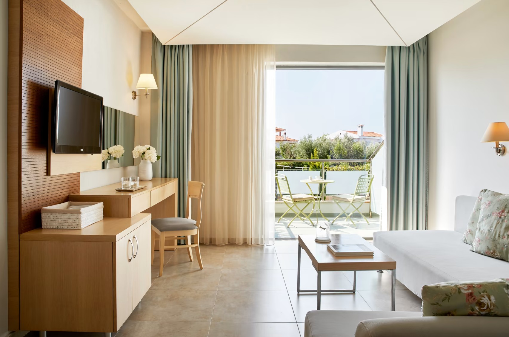 Chalkidiki - Nea Potidea | TOP 5 | In diesem modern gestalteten Hotel sind die Zimmer auf mehrere Gebäude verteilt und harmonisch in das weitläufige Gartengelände eingebettet. Die Pools sowie der flach abfallende Strand laden mit traumhaftem Ausblick zum Entspannen und Verweilen ein.