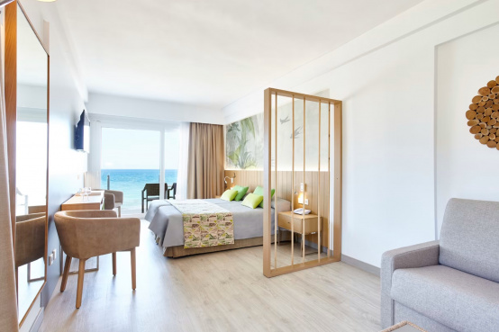 - Juniorsuite, im Hauptgebäude, Meerseite, Meerblick, ca. 35 m², letzte Teilrenovierung 2019, Gesamtanzahl der Räume in diesem Zimmertyp: 1, Aufteilung wie folgt: kombiniertes Wohn-/Schlafzimmer, 2 Einzelbetten, 1 Schlafsofa, Babybett: ohne Gebühr, Reservierung notwendig, Klimaanlage: ohne Gebühr, individuell regelbar, zentral gesteuert, kalt, warm, Fußboden: Laminat, Safe: ohne Gebühr, Schreibtisch, Kühlschrank: ohne Gebühr, Nespressomaschine, Minibar: Wasser: ohne Gebühr, Telefon, Internet: WLAN/WiFi: ohne Gebühr, Fernseher: Flatscreen, deutsches Programm, Sat-TV, Reinigungsservice: täglich, ohne Gebühr, Badewanne, WC, Föhn, Balkon: mit Sitzgelegenheit