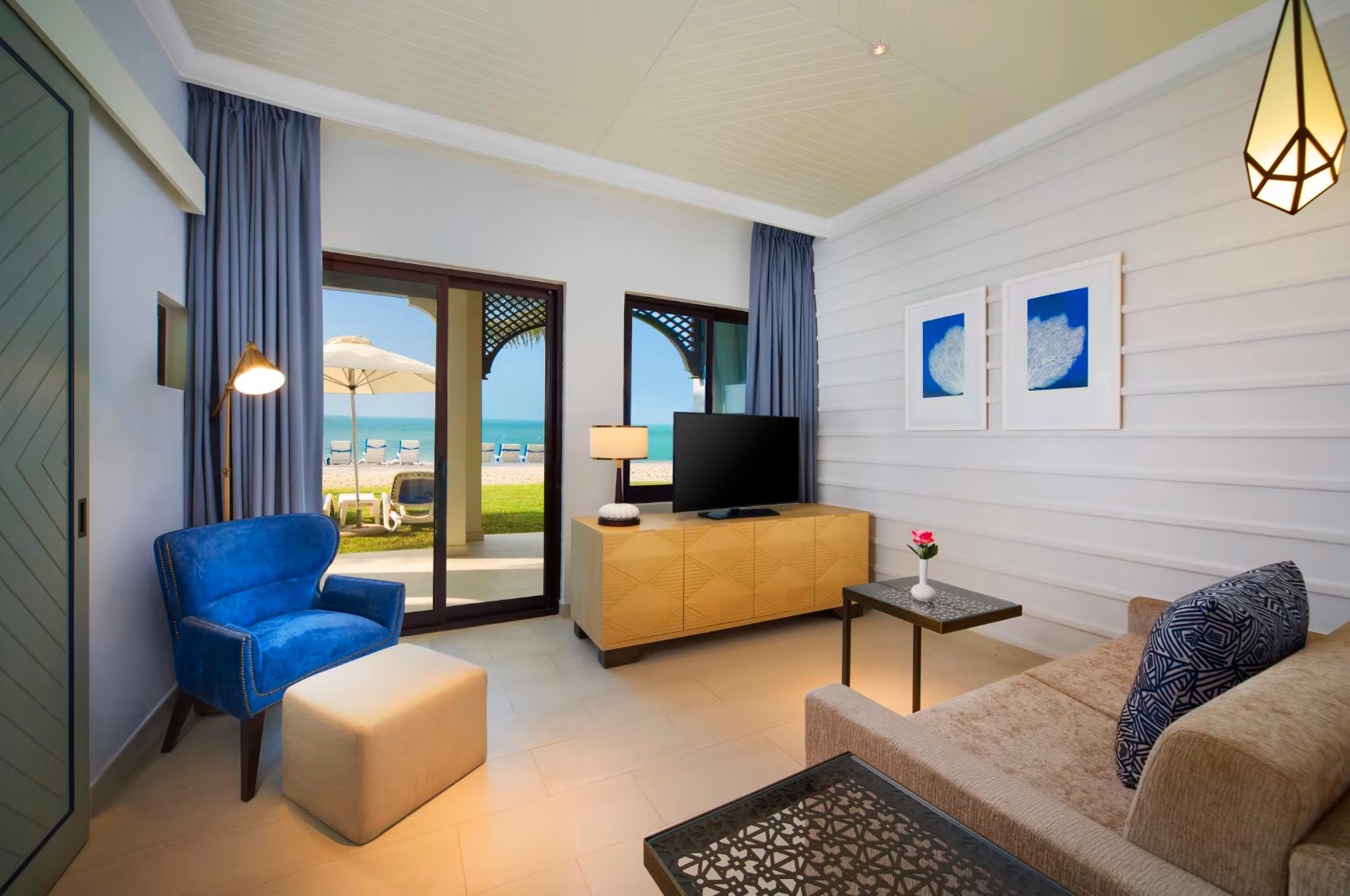 - Villa, Nichtraucherzimmer, im Nebengebäude, Meerseite, Meerblick, ca. 145 m², letzte Teilrenovierung 2018, Gesamtanzahl der Räume in diesem Zimmertyp: 2, Aufteilung wie folgt: bestehend aus 2 Doppelzimmern mit Verbindungstür, Wohnzimmer, 2 King Size Betten (180x200cm), Klimaanlage: individuell regelbar, Fußboden: Fliesenboden, Safe, Sofa, Schreibtisch, Bügeleisen, Bügelbrett, Kaffeemaschine, Kaffee-/Teezubereiter, Minibar, Telefon, Internet: WLAN/WiFi, Fernseher: Flatscreen, Roomservice, Reinigungsservice, Dusche, Badewanne, Bademantel, Slipper, 2 Bäder, Föhn, Kosmetikspiegel, Terrasse: mit Sitzgelegenheit, mit Plunge Pool, Nebenkosten: Kaution : 130 EUR