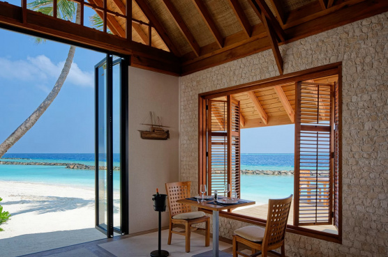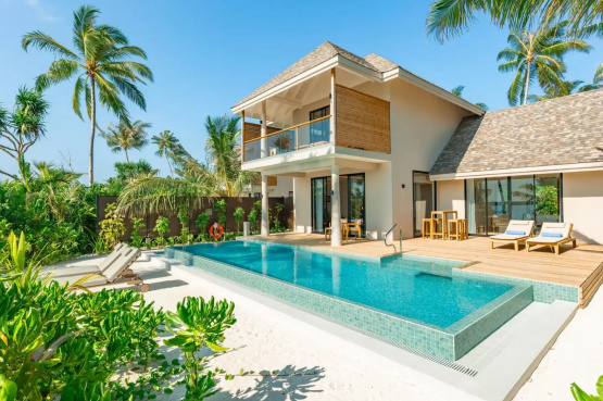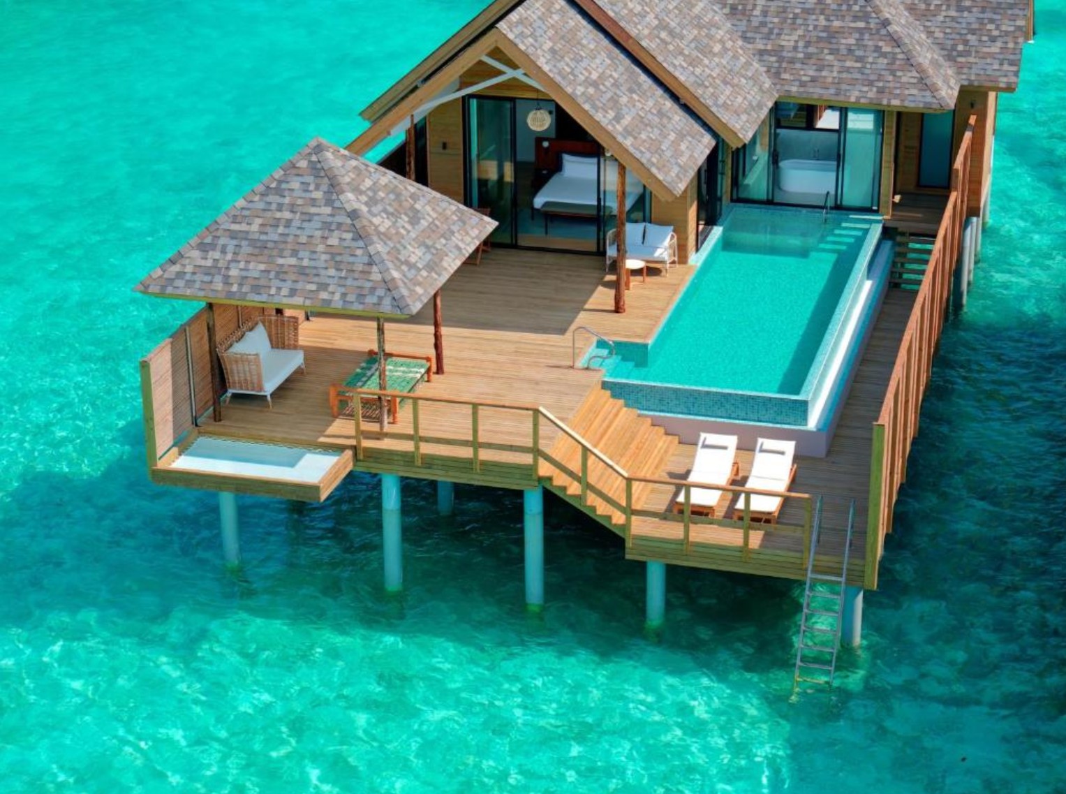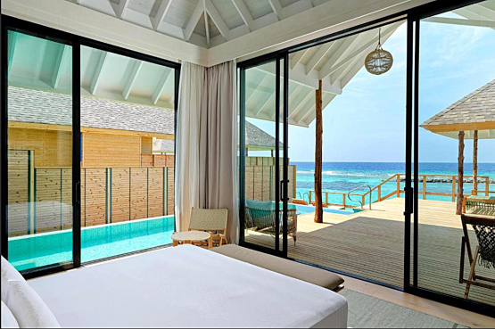 - >300 qm, Villa, freistehend, 2 Etagen, freistehend, Wasserbungalow (auf Stelzen über der Lagune), 3 separate Schlafzimmer, separater Wohnraum, Ankleidebereich, 3 Bäder, Badewanne, Regendusche, Außendusche, WC, Bademantel, Badeslipper, Haartrockner, Klimaanlage, Ventilator, Minibar kostenpflichtig, Safe, TV, Bluetooth-Lautsprecher, WLAN, Wasserkocher, Espressomaschine, Kaffee/Tee, Sonnendeck (möbliert), direkter Meerzugang, Privatpool