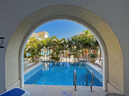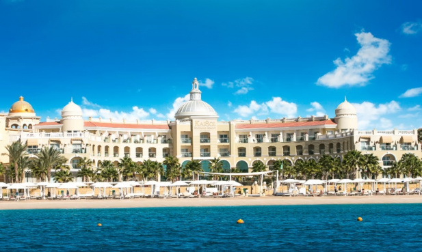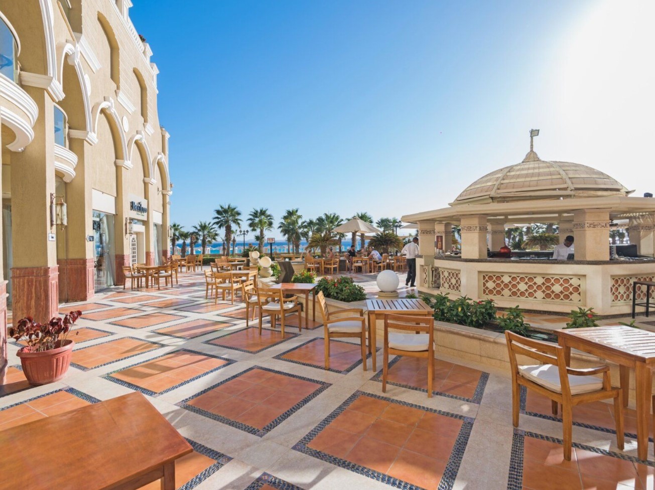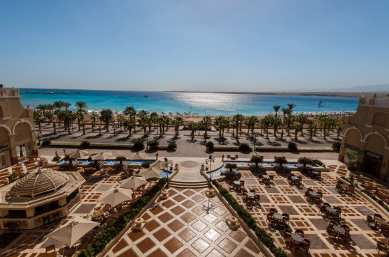 Rotes Meer - Sahl Hasheesh | Wie an einem Palast aus tausendundeiner Nacht erstrahlt die cremefarbene Fassade des mit Zwiebeltürmen geschmückten Adults-only-Hotels im Sonnenlicht. Edler Marmor und die Terrasse im Mosaik-Design mit Pool, Bar und Loungebereich unterstreichen das exklusive Ambiente.