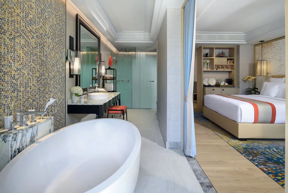 - 46-50 qm, Doppel, Poolblick, kombinierter Wohn-/Schlafraum, Sitzecke, Schreibtisch, Dusche oder Badewanne, Bademantel, Badeslipper, Haartrockner, Kosmetikspiegel, Klimaanlage, Minibar, Auffüllung regelmäßig, Softdrinks, Safe, Bügeleisen, TV (Sat-TV, PayTV, Flachbildschirm), DVD-Player, Balkon (möbliert), direkter Poolzugang, Butlerservice, Zutritt zur Club-Lounge, Frühstück in der Club-Lounge, nachmittags Kaffee/Tee und Gebäck, bei Ankunft im Zimmer Wasser