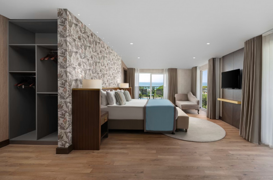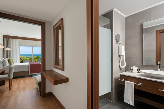 - Poolseite, ca. 40 m², Gesamtanzahl der Räume in diesem Zimmertyp: 2, Aufteilung wie folgt: kombiniertes Wohn-/Schlafzimmer, 1 Schlafzimmer, 1 Doppelbett, 2 Schlafsofas, Babybett: ohne Gebühr, Klimaanlage: individuell regelbar, Fußboden: Fliesenboden, Safe: ohne Gebühr, Kaffee-/Teezubereiter, Wasserkocher, Minibar: ohne Gebühr, Softdrinks: ohne Gebühr, Wasser: ohne Gebühr, Telefon, Internet: WLAN/WiFi: ohne Gebühr, Fernseher: Flatscreen, deutsches Programm, Sat-TV, Dusche, WC, Bademantel, Slipper, Föhn, Balkon: mit Sitzgelegenheit