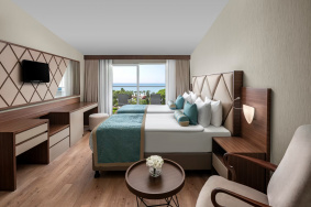 - Doppelzimmer, Meerblick, ca. 28 m², Gesamtanzahl der Räume in diesem Zimmertyp: 1, Aufteilung wie folgt: 1 Schlafzimmer, 1 Einzelbett, 1 Doppelbett (140cm), Babybett: ohne Gebühr, Klimaanlage: zentral gesteuert, Fußboden: Parkett, Safe: ohne Gebühr, Kaffee-/Teezubereiter, Wasserkocher, Minibar: ohne Gebühr, Softdrinks: ohne Gebühr, Wasser: ohne Gebühr, Telefon, Internet: WLAN/WiFi: ohne Gebühr, Fernseher: Flatscreen, deutsches Programm, Sat-TV, Dusche, WC, Bademantel, Slipper, Föhn, Balkon: mit Sitzgelegenheit