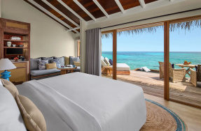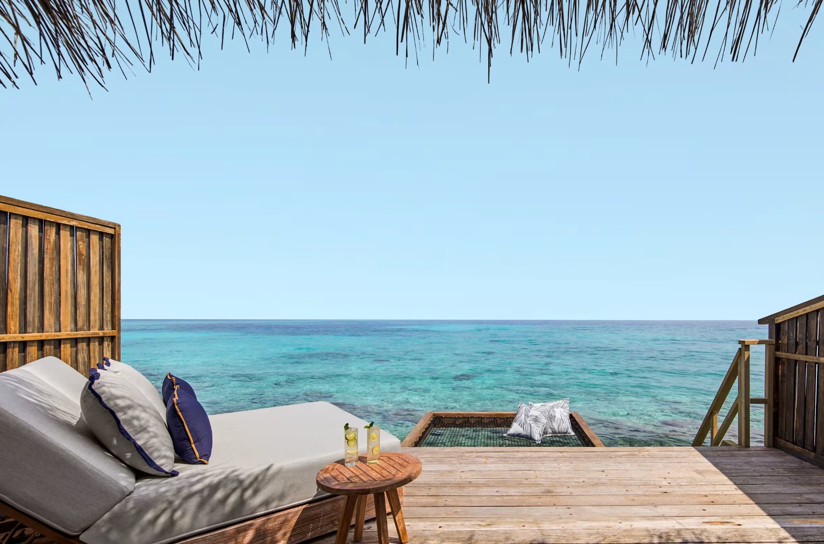 - 61-70 qm, Villa, Wasserbungalow (auf Stelzen über der Lagune), Meerblick, Dusche, Badewanne, WC, Haartrockner, Klimaanlage, Ventilator, Minibar kostenpflichtig, Safe, TV, Bluetooth-Lautsprecher, WLAN, Wasserkocher, Espressomaschine, Kaffee/Tee, Terrasse (möbliert), direkter Meerzugang