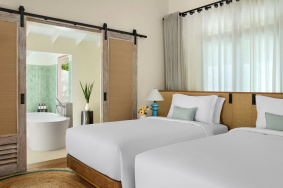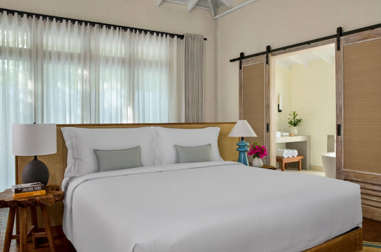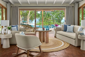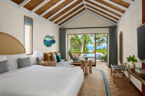 - 101-120 qm, Villa, mit Verbindungstür, freistehend, Strandlage, Sonnenuntergangsseite, 2 separate Schlafzimmer, 2 Bäder, nach oben halb offenes Bad, Badewanne, Außendusche, WC, Haartrockner, Klimaanlage, Ventilator, Minibar kostenpflichtig, Safe, 2 TVs, Bluetooth-Lautsprecher, WLAN, Wasserkocher, Espressomaschine, Kaffee/Tee, Terrasse (möbliert), Privatpool