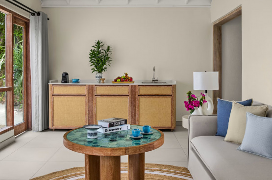 - 46-50 qm, Villa, Deluxe, Sonnenuntergangsseite, Sitzecke, nach oben halb offenes Bad, Badewanne, Regendusche, WC, Haartrockner, Klimaanlage, Ventilator, Minibar kostenpflichtig, Safe, TV, Bluetooth-Lautsprecher, WLAN, Wasserkocher, Espressomaschine, Kaffee/Tee, Terrasse (möbliert)